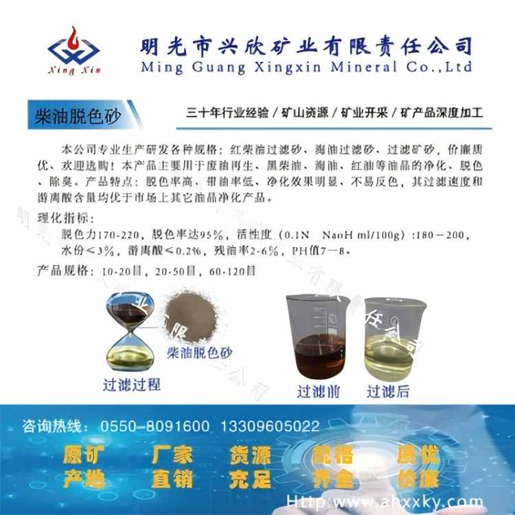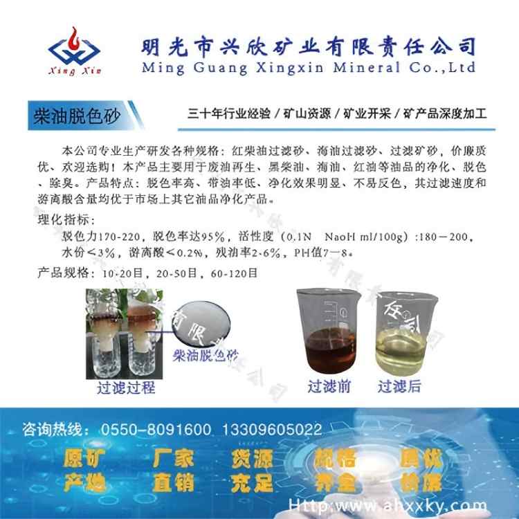 主营产品:柴油脱色剂,颗粒脱色剂,塑料油脱色剂,柴油脱色砂,油品过滤砂,柴油过滤砂,汽油脱色剂,柴油除臭剂,油品脱色剂,油品吸附剂,活性白土,颗粒白土,涂料增稠剂,涂料悬浮剂,涂料触变剂,无机粘合剂,分子筛粘合剂,保温材料粘合剂,农药颗粒剂载体,农药可湿粉填料,复合肥粘合剂,复混肥粘合剂,硅藻土,膨润土等
