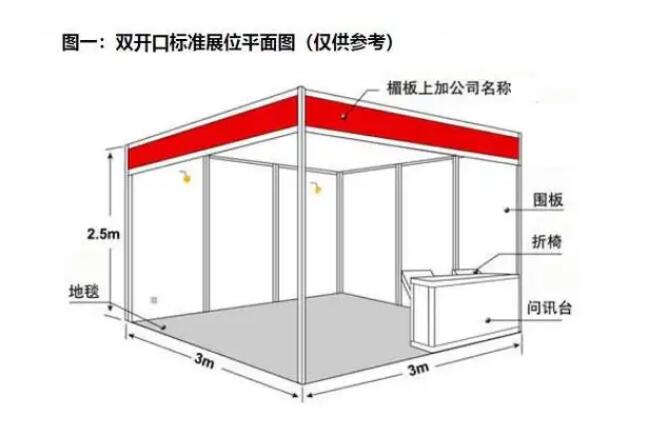标准展位配备:三面展板、楣板、一张洽谈桌、两把折叠椅、220V电源插座。